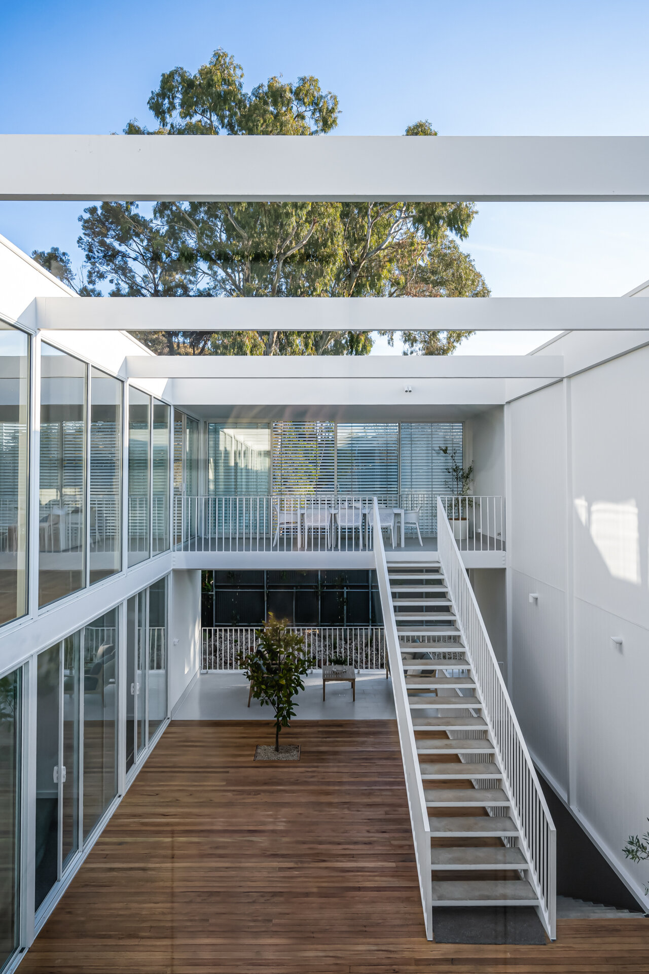 The design is modern with an open-plan entrance level, including a kitchen with European appliances, a living area, and a master bedroom with ensuite. Large glass walls in the living areas show views of the courtyard and pool. The lower level has more bedrooms, another living space, and a bathroom. There’s a garden at the rear for privacy. The McLaren St homes combine design and function.