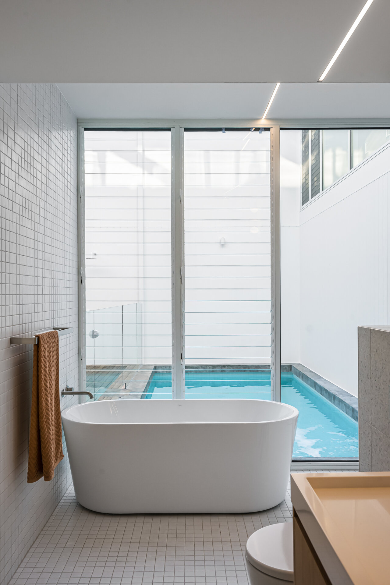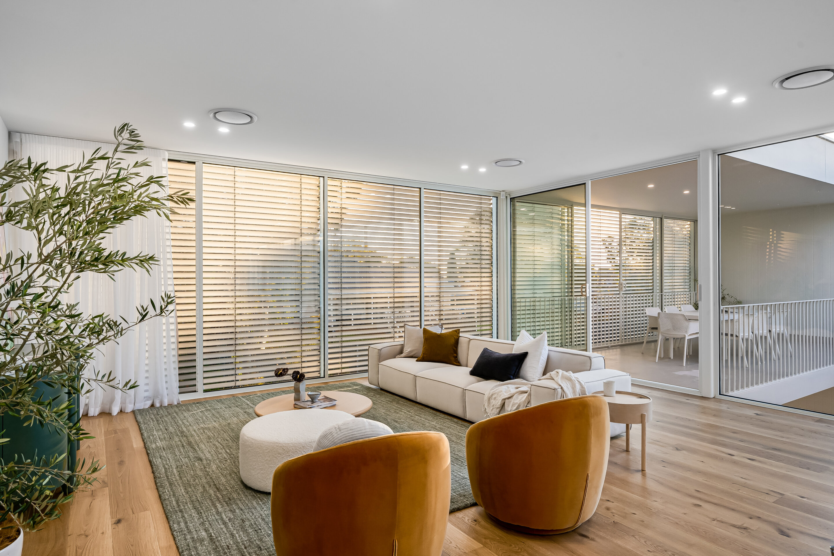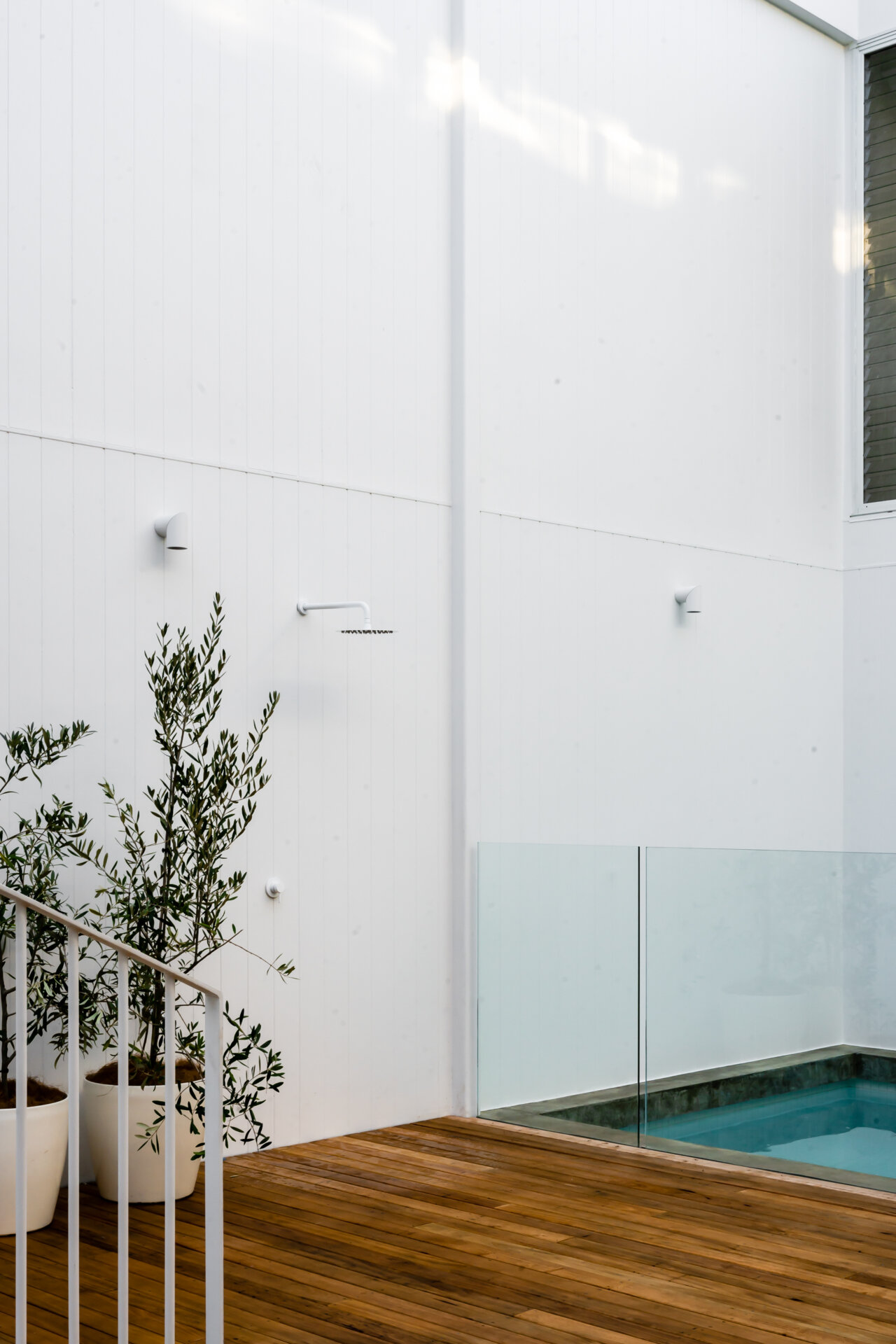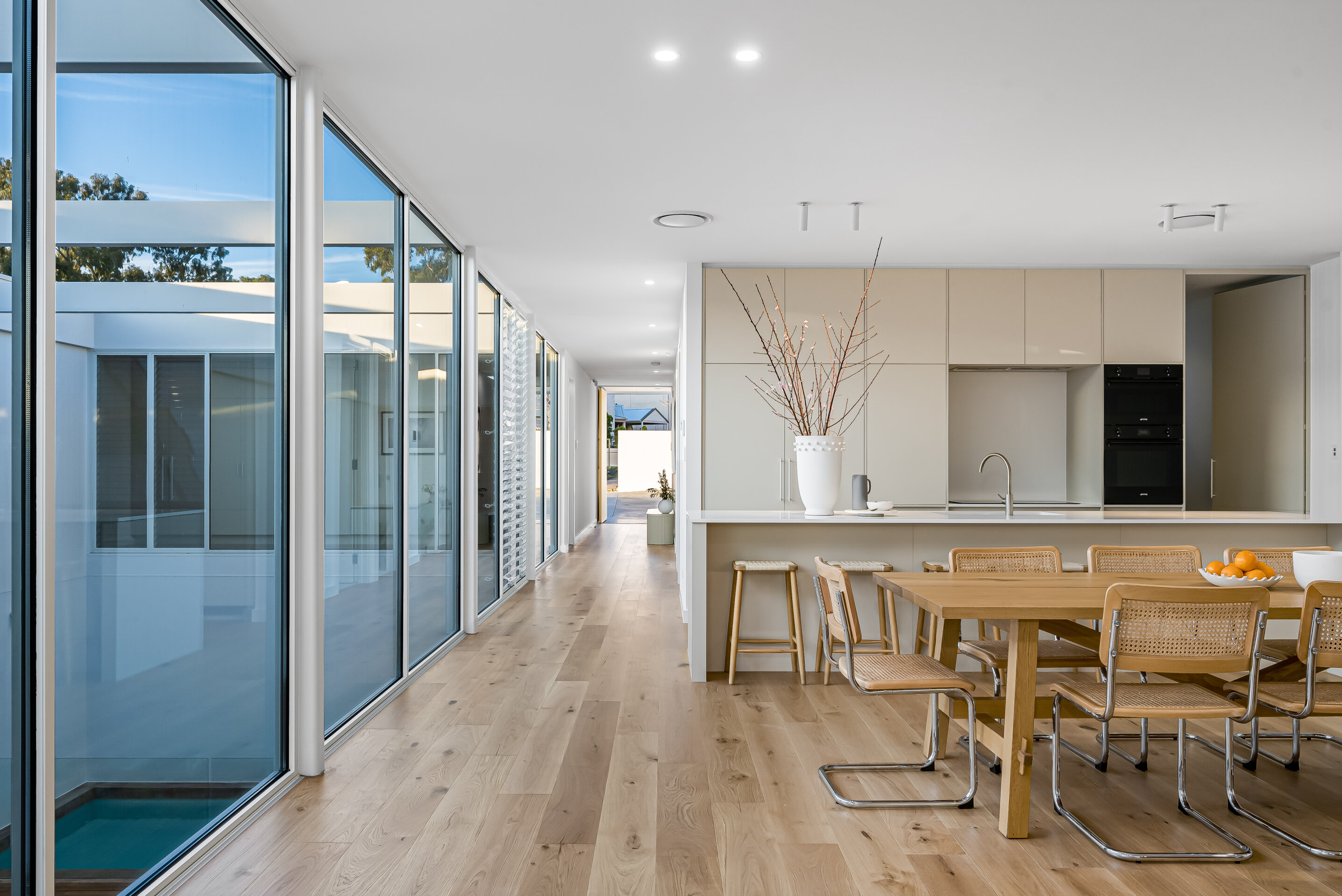 The design is modern with an open-plan entrance level, including a kitchen with European appliances, a living area, and a master bedroom with ensuite. Large glass walls in the living areas show views of the courtyard and pool. The lower level has more bedrooms, another living space, and a bathroom. There’s a garden at the rear for privacy. The McLaren St homes combine design and function.